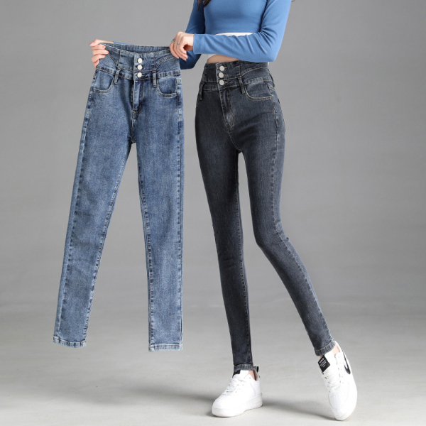 쓰리버튼 하이웨스트 사방스판 워싱 데님 청바지