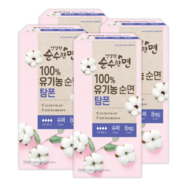 [깨끗한나라] 순수한면 유기농 탐폰 슈퍼 8개입 4팩