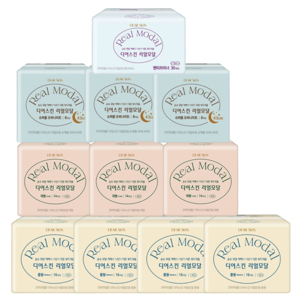 디어스킨 리얼모달 중형(16P) 4팩+대형(14P) 3팩+오버나이트(8P) 3팩+팬티라이너(30P) 1팩