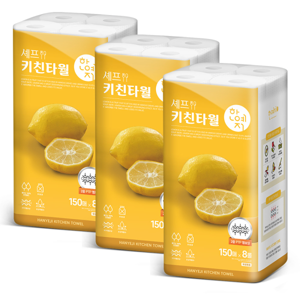 한예지 천연펄프 셰프키친타올 150매 8롤 (3팩)