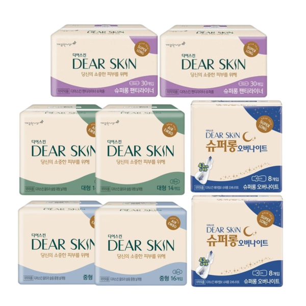 디어스킨 에어엠보 중형(16P) 2팩+ 대형(14P) 2팩+오버나이트(8P) 2팩+팬티라이너(30P) 2팩