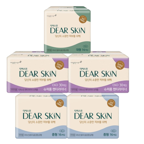 디어스킨 에어엠보 중형(16P) 2팩+ 대형(14P) 1팩+팬티라이너(30P) 2팩