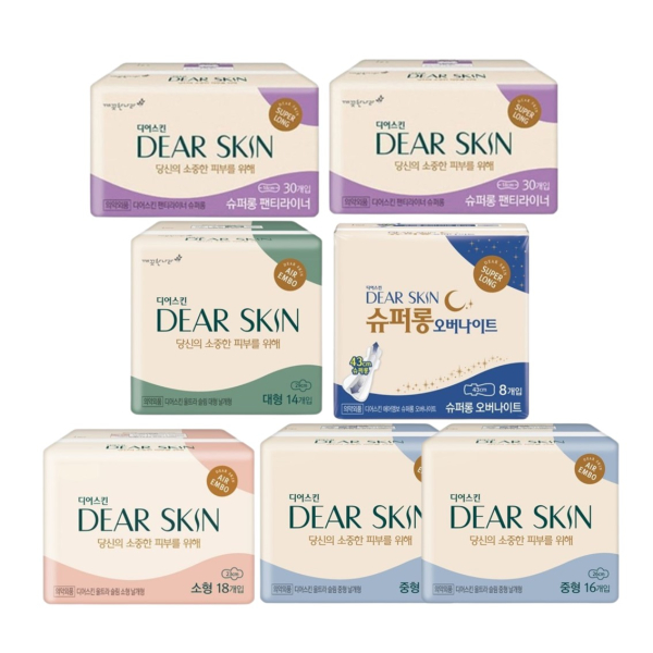 디어스킨 에어엠보 소형(18P) 1팩+중형(16P) 2팩+ 대형(14P) 1팩+오버나이트(8P) 1팩+팬티라이너(30P) 2팩