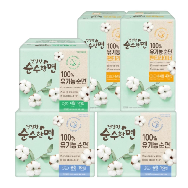 건강한 순수한면 유기농 순면 중형(16P) 2팩+오버나이트(12P) 1팩+팬티라이너(40P) 2팩