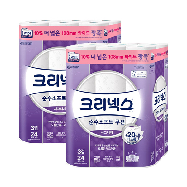 크리넥스 3겹 순수소프트 쿠션 화장지 (108mm 광폭) 26m 24롤 x2개