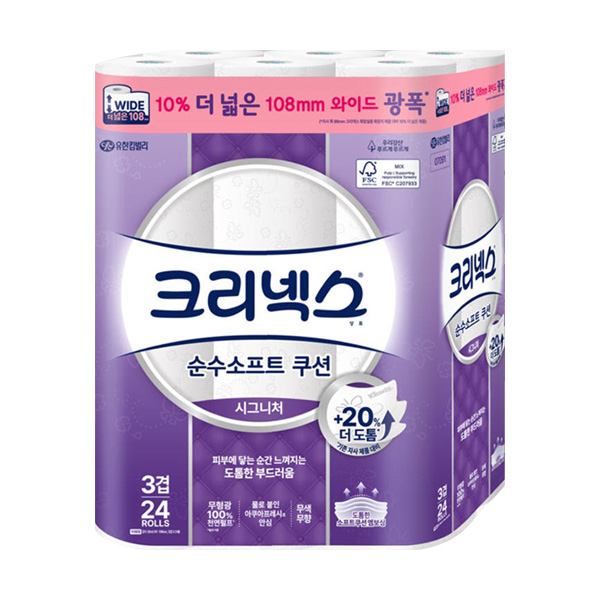 크리넥스 3겹 순수소프트 쿠션 화장지 (108mm 광폭) 26m 24롤 x1개