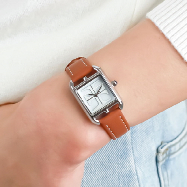 [탠디] 시그니쳐 모던스퀘어 여성용 가죽 시계 T-1916 실버브라운