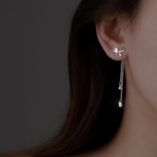 S925 클리어 큐빅 리본 체인 드롭 귀걸이