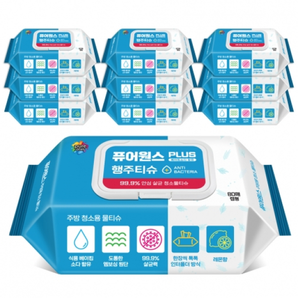 [퓨어원스+]홈케어 청소 살균물티슈 주방용 80매x10팩(캡형) [품절]