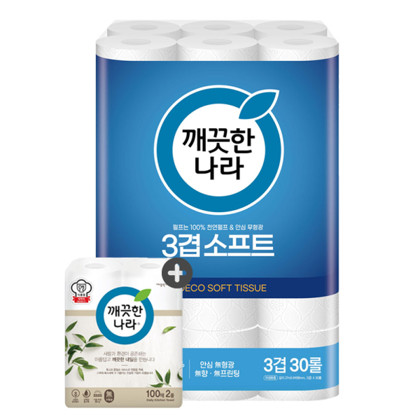 [깨끗한나라] 화장지 3겹 소프트 27m 30롤 1팩 + 키친타올 100매 2개