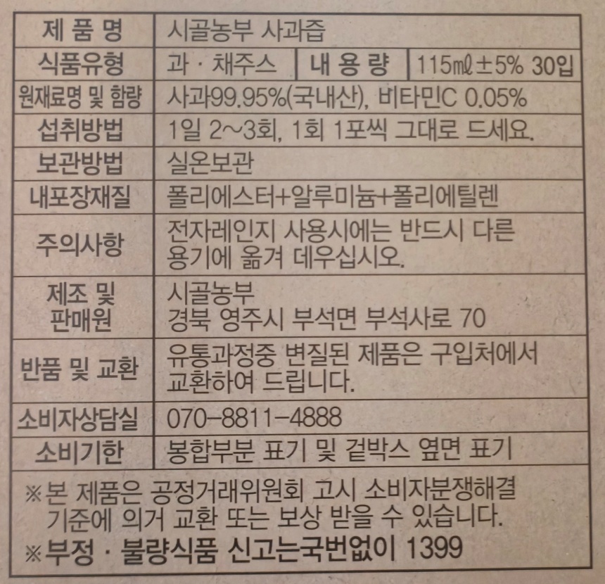 | 항목 | 시골농부 김덕구 사과즙 |