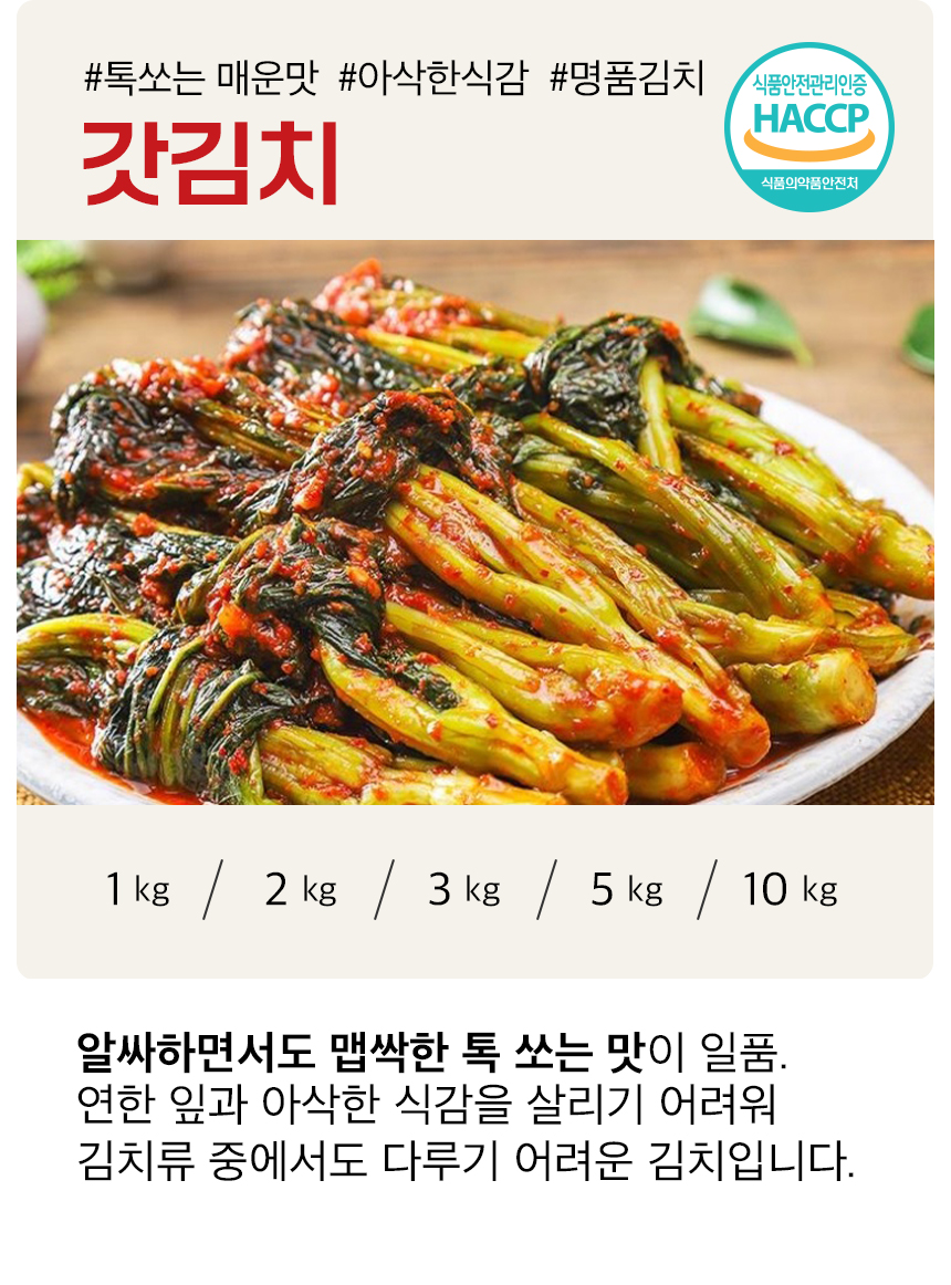 | 상품구성 | 갓김치 1kg / 2kg / 3kg / 5kg / 10kg |