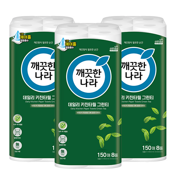 깨끗한나라 데일리 키친타올 그린티 150매 x 8롤 x 3팩