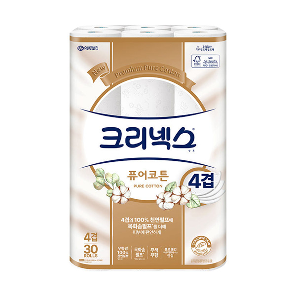 크리넥스 4겹 퓨어 코튼 화장지 25m 30롤 x1개
