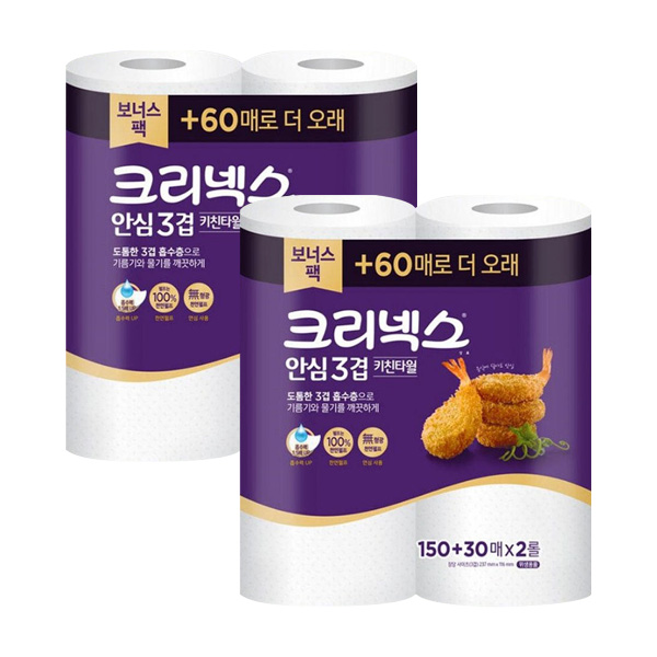 크리넥스 안심프리미엄 3겹 키친타올 (150+30매 2롤) x2팩