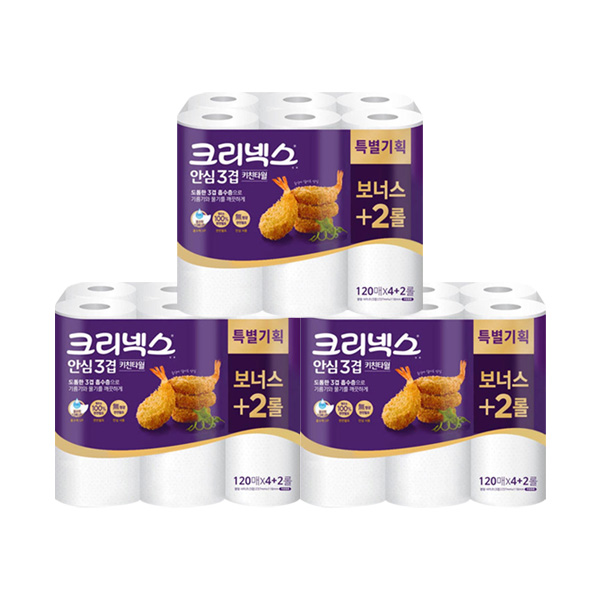 크리넥스 안심프리미엄 3겹 키친타올 120매x4+2롤 x3팩