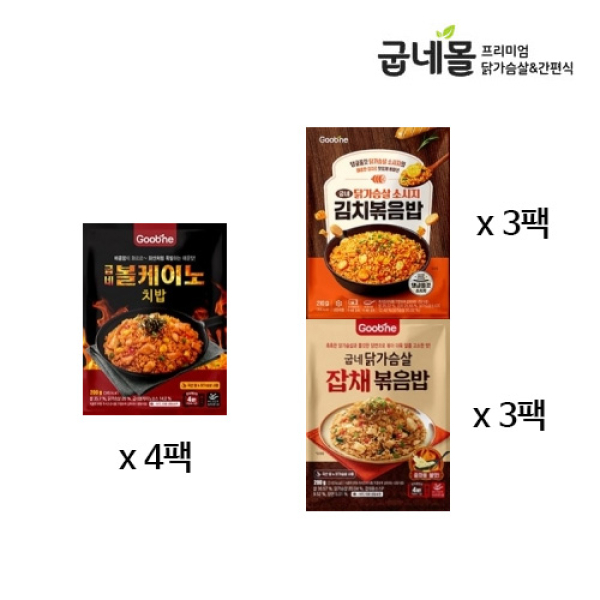 [굽네] 닭가슴살 볼케이노 치밥 4팩+닭가슴살 소시지 김치볶음밥 3팩+닭가슴살 잡채볶음밥 3팩