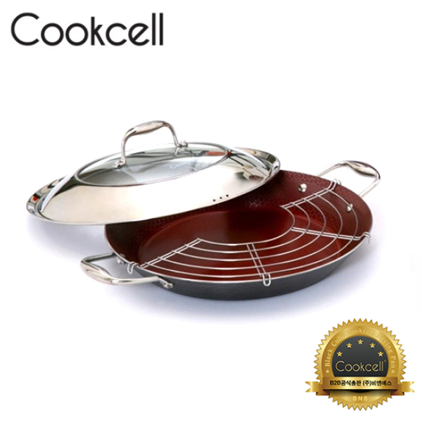 [Cookcell] 쿡셀 통3중 더블 코팅 파에야팬 레드 36cm + 스테레이너 + 유리뚜껑 / 품번 : 03056